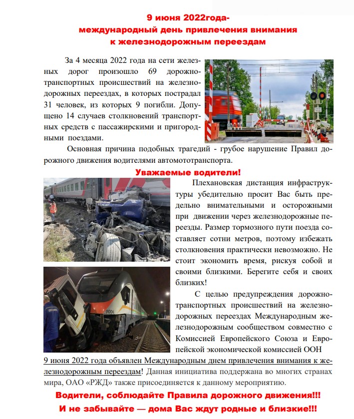 Главная » Все новости » 9 июня 2022 года международный день привлечения внимания к железнодорожным переездам 9 июня 2022 года международный день привлечения внимания к железнодорожным переездам Просмотров 165 Опубликовано 31.05.2022