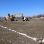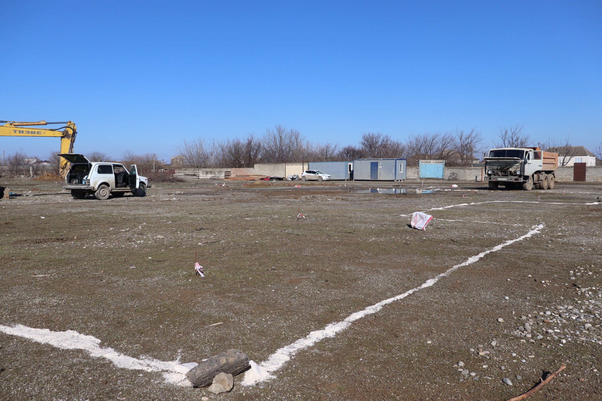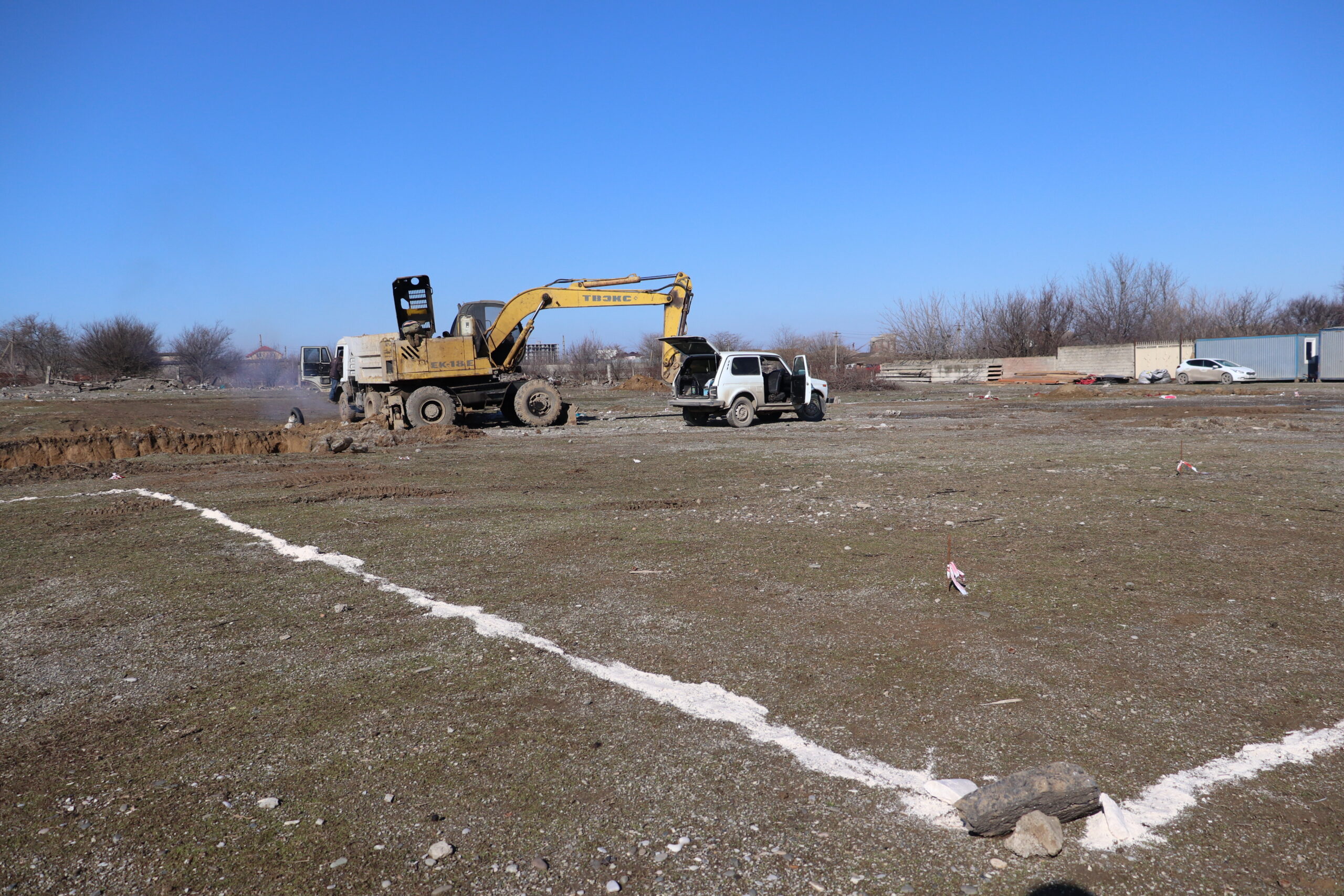 На данный момент, на пустыре, расположенном рядом со школой и парком отдыха специалисты роют котлован под фундамент.
