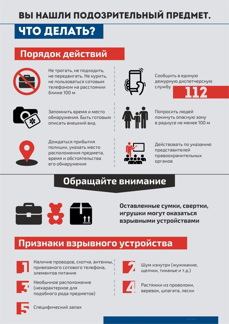 В связи с нарастанием угроз совершения на территории Российской Федерации диверсионно-террористических актов на фоне СВО отдел АТК администрации МР «Кизилюртовский район» напоминает об алгоритме действий при обнаружении подозрительного предмета или получении сообщения о заложенном взрывном устройстве