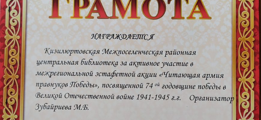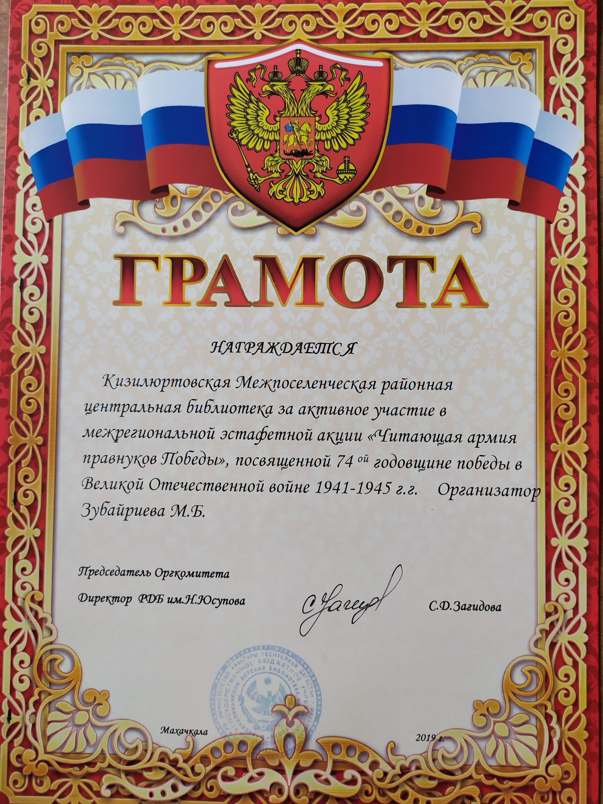 Централизованная библиотека Кизилюртовского района награждена Республиканской детской библиотекой им. Н.Юсупова Грамотой за активное участие в межрегиональной эстафетной акции «Читающая армия правнуков Победы», посвящённой 74-ой годовщине Победы в Великой Отечественной войне 1941-1945 гг.