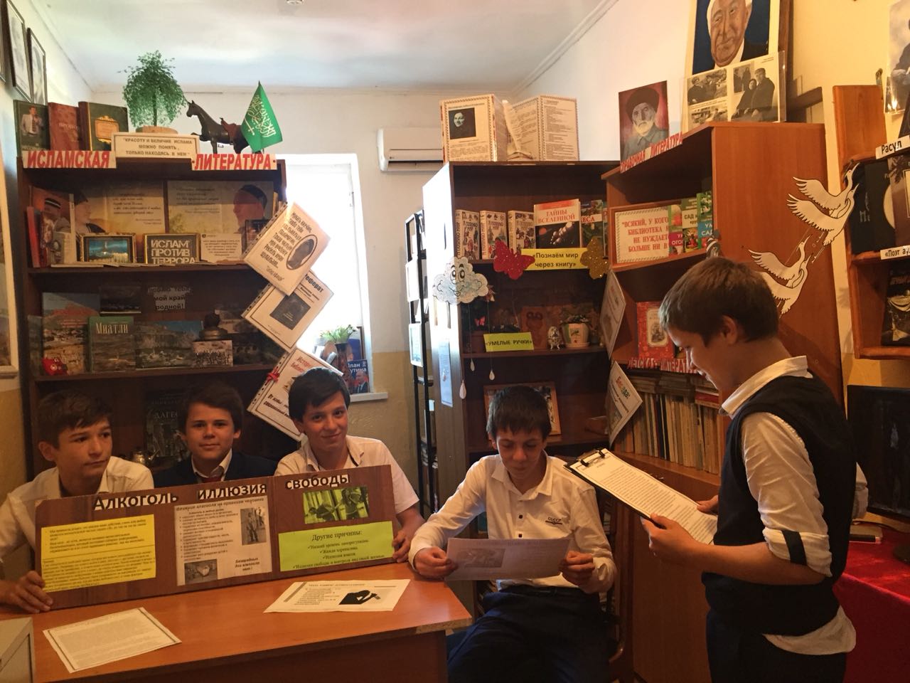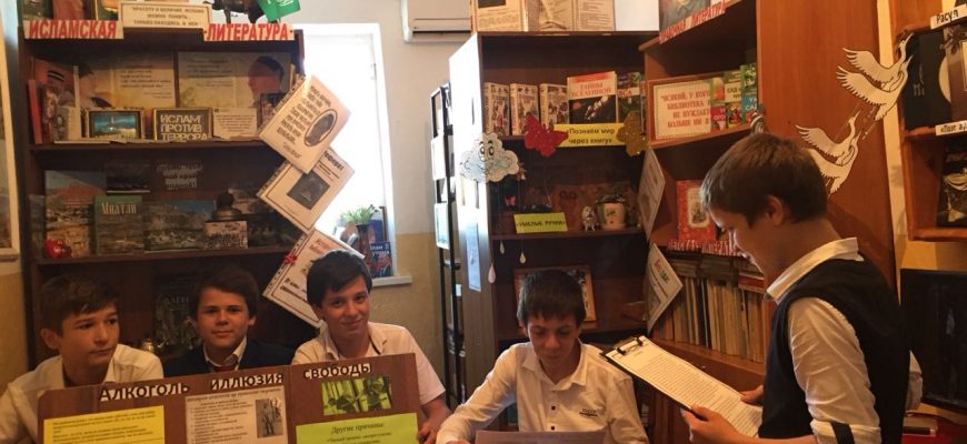 Заведующая сельской библиотекой Мадина Мусаева провела читательский час у стенда на указанную тему с учащимися старших классов.