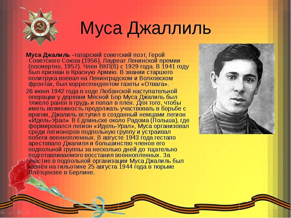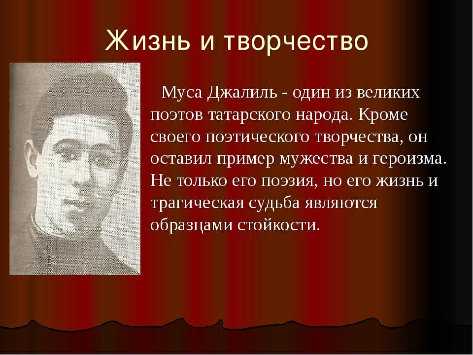 Муса Джалиль — один из великих поэтов татарского народа. Кроме своего поэтического творчества, он оставил пример мужества и героизма. Не только его поэзия, но его жизнь и трагическая судьба являются образцами стойкости.