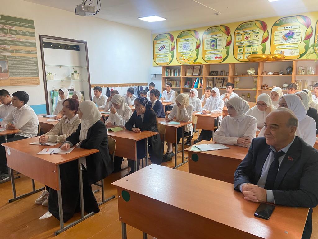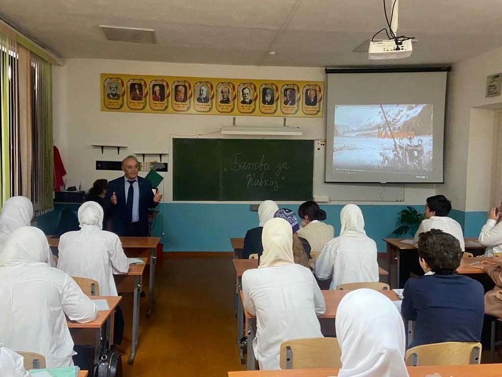 Тема урока была посвящена 80-летию победы в битве за Кавказ. Парламентарий рассказал ребятам о том, как советские солдаты героически сражались, и не дали отборным, специально обученным горным дивизиям Вермахта завладеть Кавказом, тем самим внеся огромный вклад в историю Великой Отечественной войны. Он также отметил, что и сейчас представители всех народов России, в том числе и дагестанцы, отстаивают суверенитет, свободу и независимость Родины в зоне СВО.