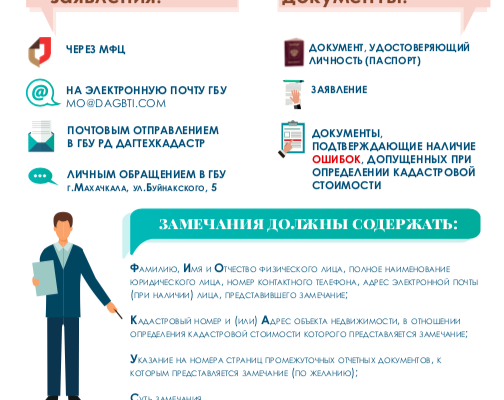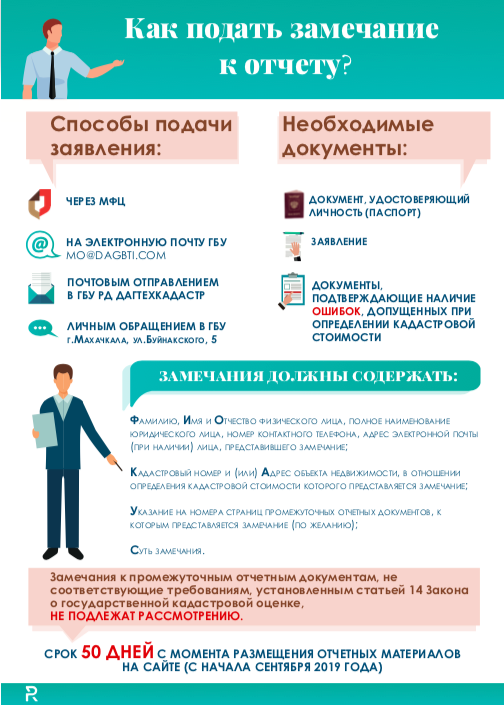 Замечания к промежуточным отчетным документам могут быть представлены в Государственное бюджетное учреждение Республики Дагестан «Дагестанское бюро по технической инвентаризации и кадастровой оценке» (ГБУ РД «Дагтехкадастр») лично, почтовым отправлением или с использованием сети «Интернет» (367000, г. Махачкала, ул. Абубакарова, 18, электронный адрес: gko@dagbti.com), а также в ГАУ РД «Многофункциональный центр предоставления государственных и муниципальных услуг в Республике Дагестан» и территориальных отделах лично.