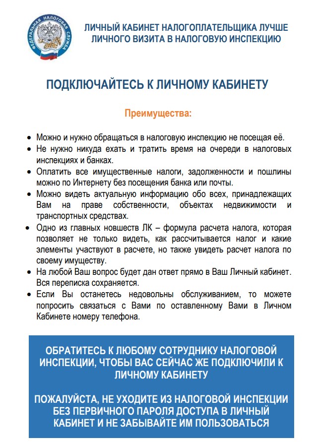Подключиться к «Личному кабинету налогоплательщика для физических лиц» Вы можете в любом налоговом органе.