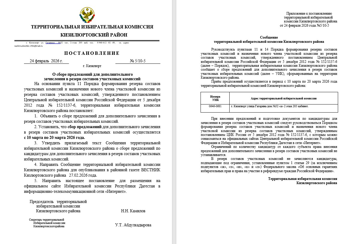 Главная » Все новости » О сборе предложений для дополнительного зачисления в резерв составов участковых комиссий О сборе предложений для дополнительного зачисления в резерв составов участковых комиссий Просмотров 2 Опубликовано 25.02.2026