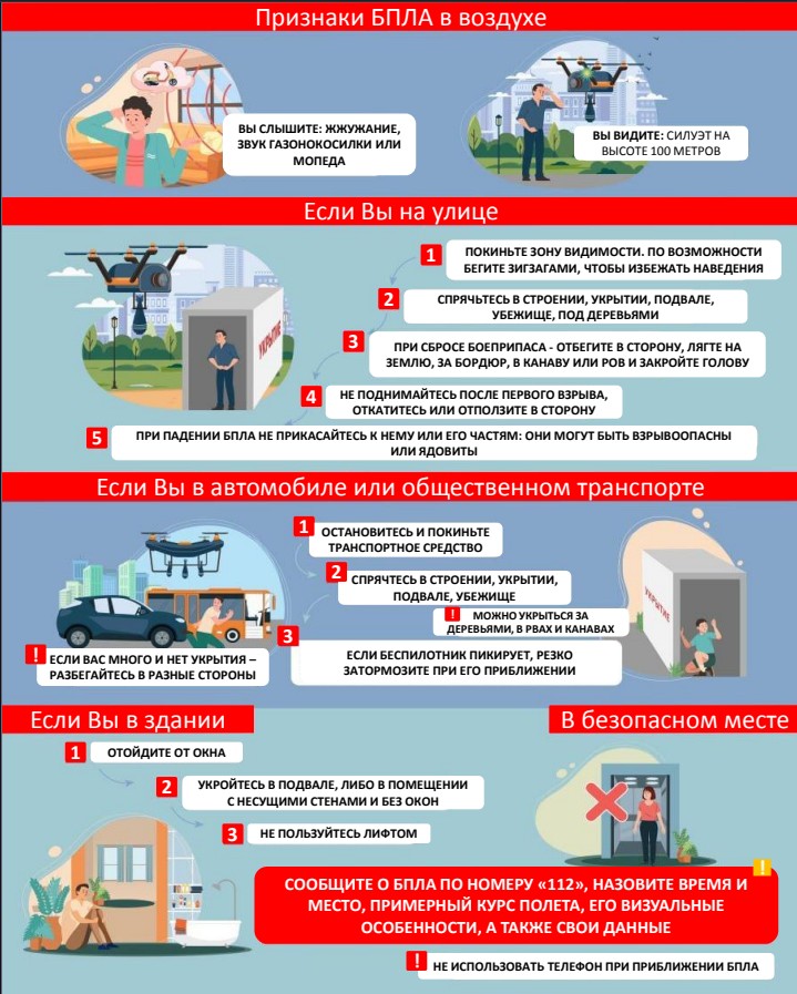 В связи с увеличением количества инцидентов, связанных с применением беспилотных летательных аппаратов в диверсионно-террористических целях на территории Российской Федерации, информируем вас о порядке действий в случае получения сигналов оповещения «Объявлена опасность атаки беспилотного летательного аппарата» и «Ракетная опасность».