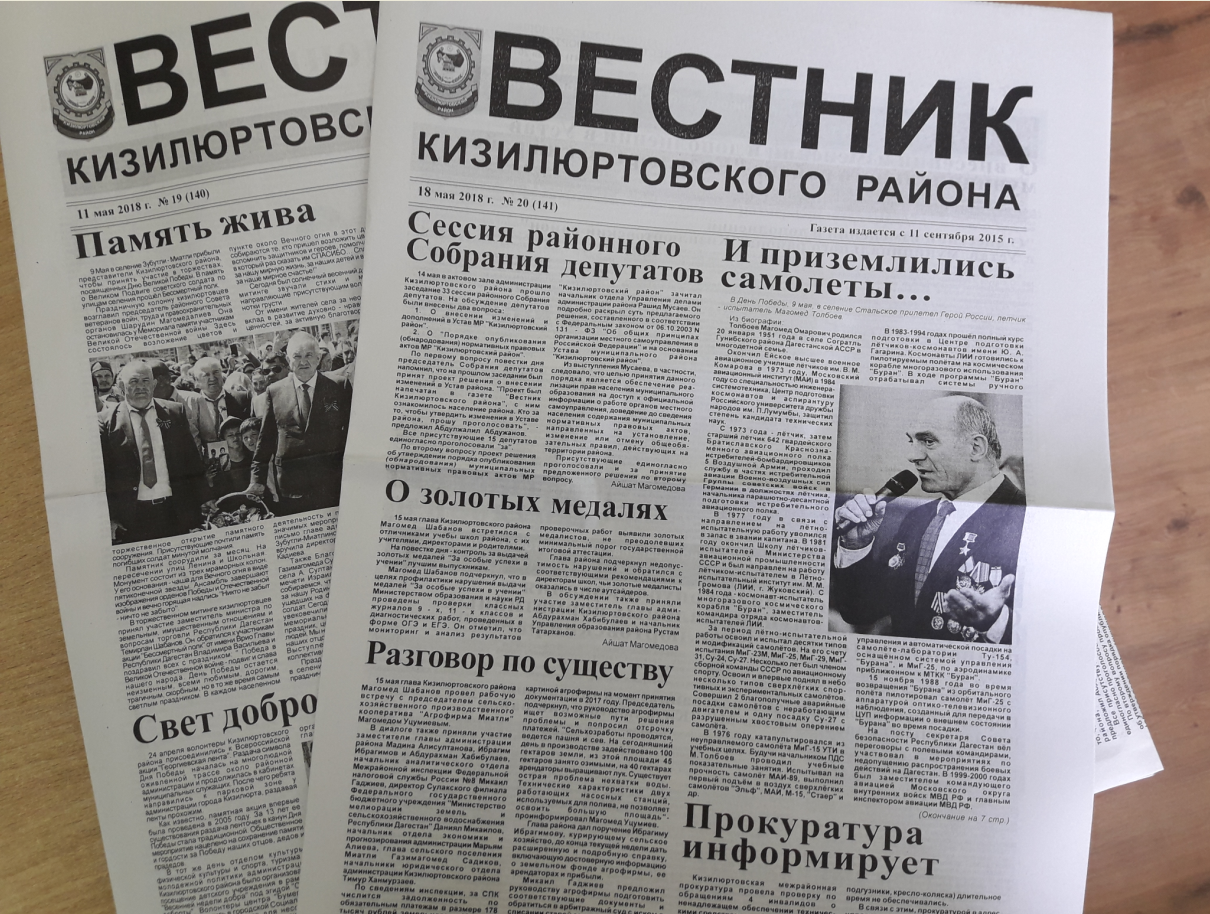 «Вестник Кизилюртовского района» – единственная газета, которая выходит на территории вашего проживания! Первый номер еженедельника вышел 11 сентября 2015 года. На протяжении почти трех лет пресс-центр администрации района старается радовать читателей интересными новостями всех 13 поселений.
