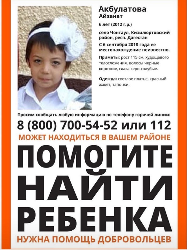 «Шестилетняя Айзанат Акбулатова пропала в селе 6 сентября. До настоящего времени ее местонахождение неизвестно. К поискам, которые ведут полицейские, 7 сентября подключились местные жители, поисковый отряд «Лиза Алерт» и 35 волонтеров Национального центра помощи пострадавшим и пропавшим детям. Поиски продолжаются и сегодня, 9 сентября, в окрестностях сельского поселения силами местных добровольцев», — сообщил глава селения Чонтаул Казакбий Умалатов.
