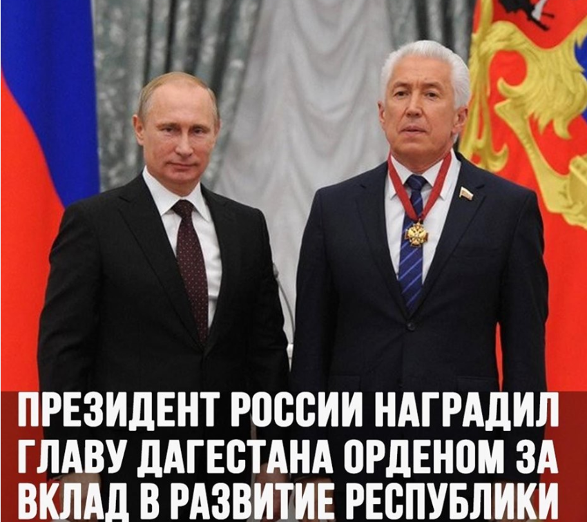 «За большой вклад в социально-экономическое развитие региона и многолетнюю добросовестную работу наградить орденом «За заслуги перед Отечеством» II степени Васильева Владимира Абдуалиевича — Главу Республики Дагестан», — говорится в Указе, подписанном Президентом РФ Владимиром Путиным.