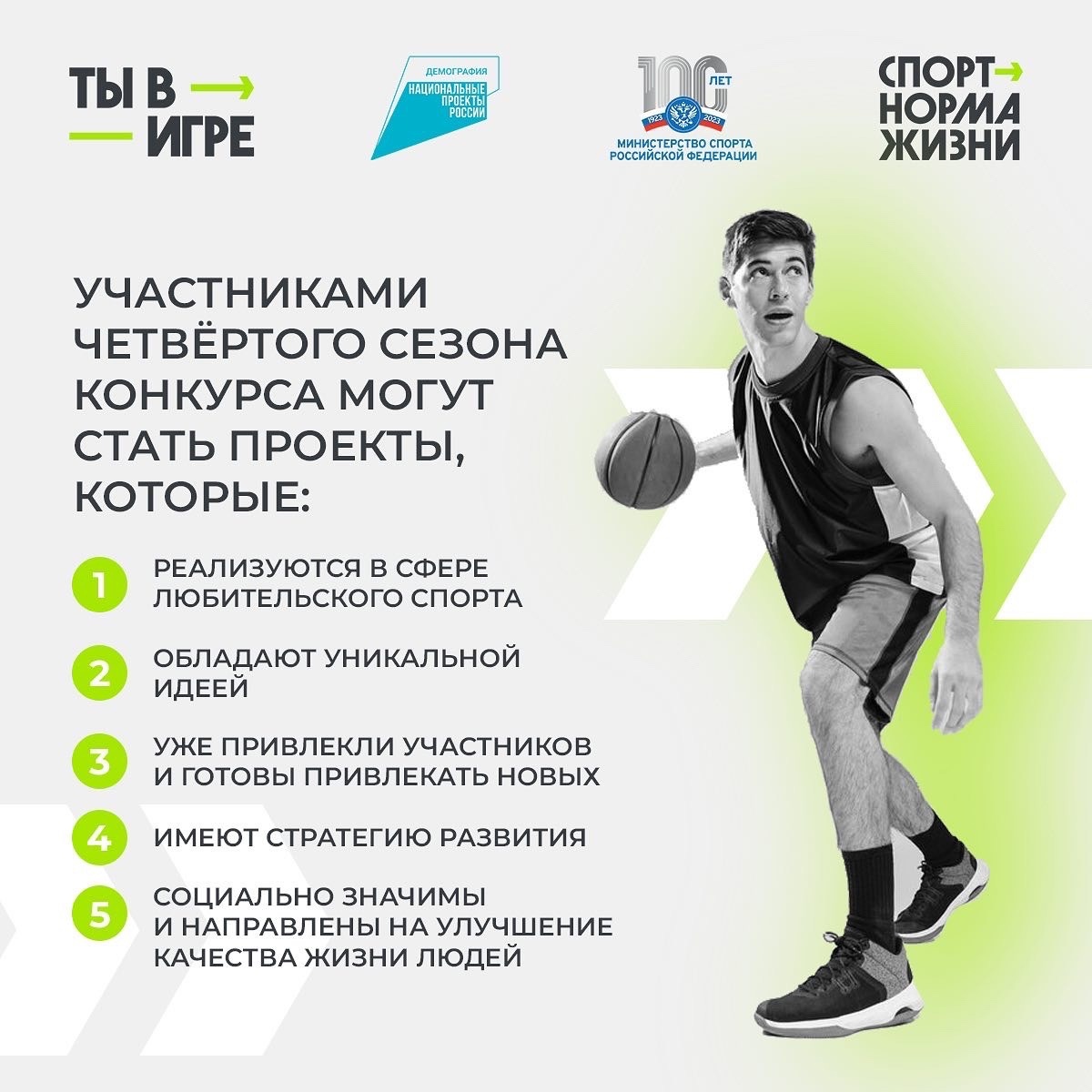 Конкурс проводится АНО «Национальные приоритеты» при поддержке Министерства спорта Российской Федерации благодаря федеральному проекту «Спорт — норма жизни» национального проекта «Демография». Подробная информация о четвертом сезоне «Ты в игре» публикуется на официальном сайте конкурса тывигре.рф