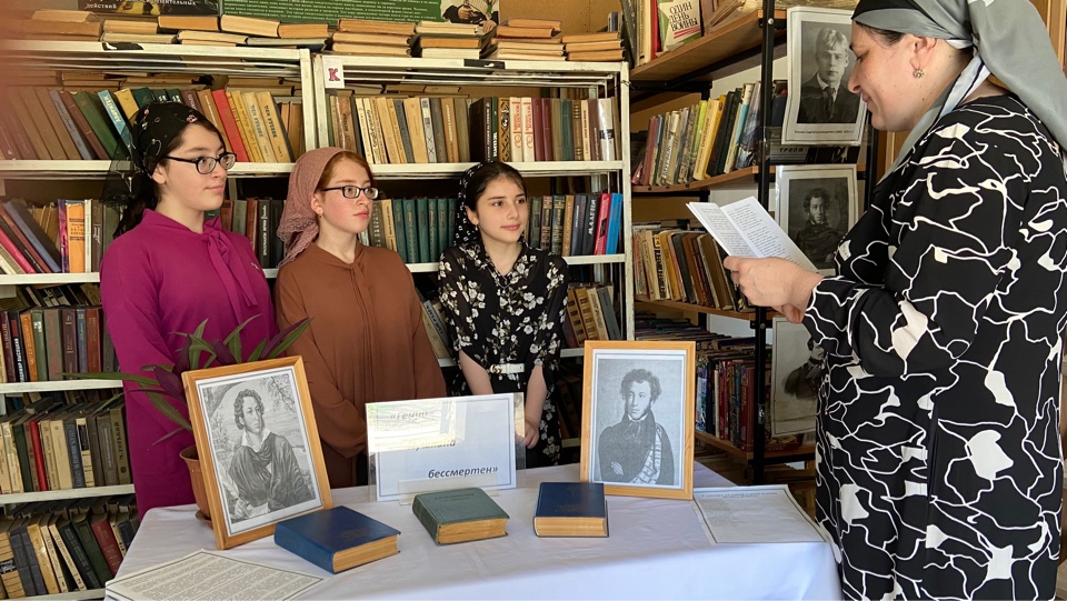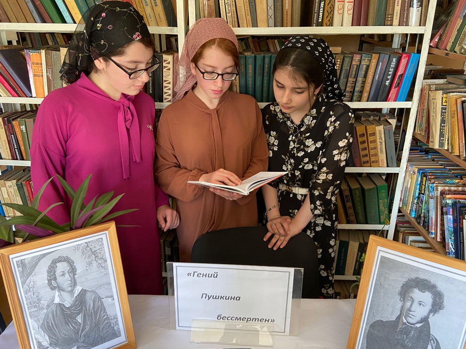 Заведующая сельской библиотекой Месей Алхилаева провела беседу с учениками Новочиркейской СОШ№ 2 .Она осветила хронологическую канву биографии А.С. Пушкина, зачитала цитаты литературоведческих статей, напомнила имена его выдающихся современников, рассказала о быте и культурных явлениях той эпохи.