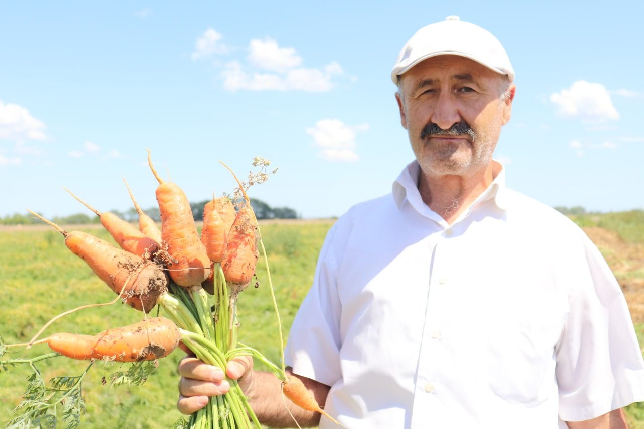 По словам Рамазана Хабиева, здесь на 15 гектарах идет посадка озимого (позднего) лука и сбор урожая моркови (3 гектара). Земледелец рассказал, что с одного гектара он получает 50-60 тонн урожая лука.