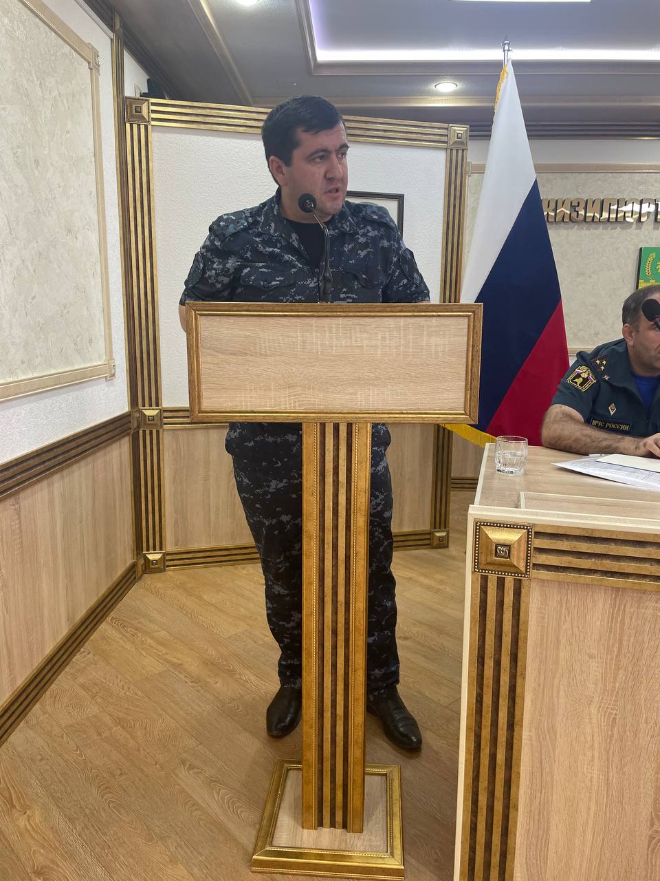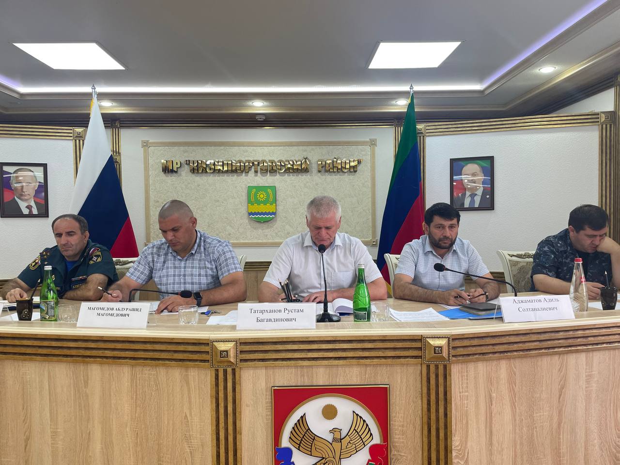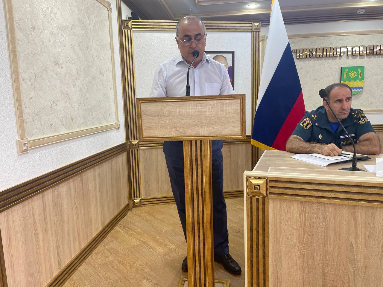 В президиуме — руководитель муниципалитета Рустам Татарханов, председатель районного Собрания депутатов Абдурашид Магомедов, заместитель главы администрации района Адиль Аджаматов, старший инспектор ГОООПОО МОВО по г. Кизилюрт, филиала ФГКУ «УВО ФНГ России по РД» Рашид Гаджиев и начальник ОНД и ПР № 6 ГУМЧС России по РД Рамин Ахмедов.