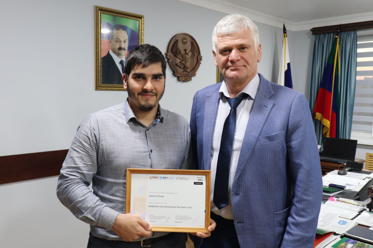 Глава Кизилюртовского района Рустам Татарханов поздравил Шамиля Исаева с успешным завершением обучения и пожелал не останавливаться на достигнутом.