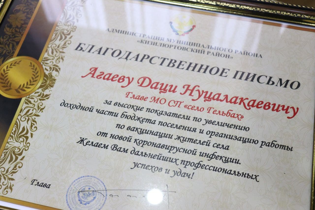 10 февраля глава Кизилюртовского района Рустам Татарханов вручил благодарственное письмо главе села Гельбах Даци Агаеву за высокие показатели по увеличению доходной части бюджета населения и организацию работы по вакцинации жителей села от новой коронавирусной инфекции.