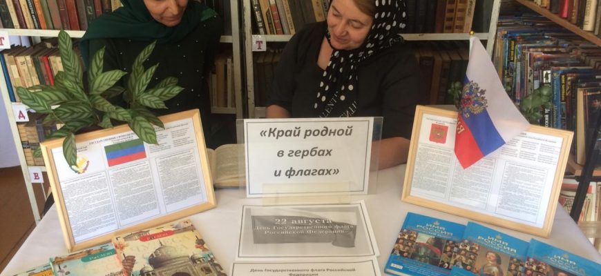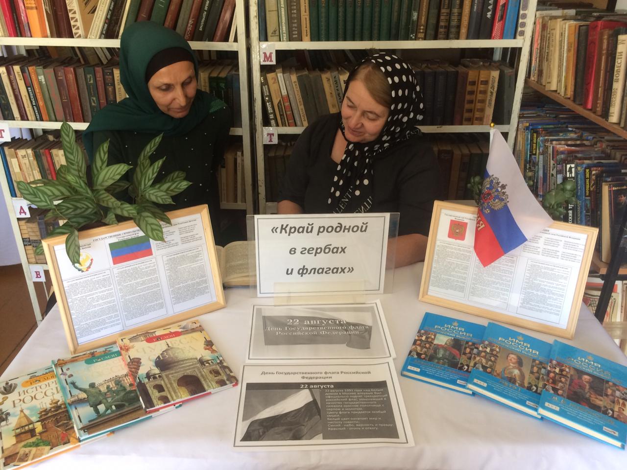 20 августа заведующая библиотекой селения Новый Чиркей Месей Алхилаева оформила книжную выставку на тему «Край родной в гербах и флагах», приуроченную ко Дню государственного флага России.