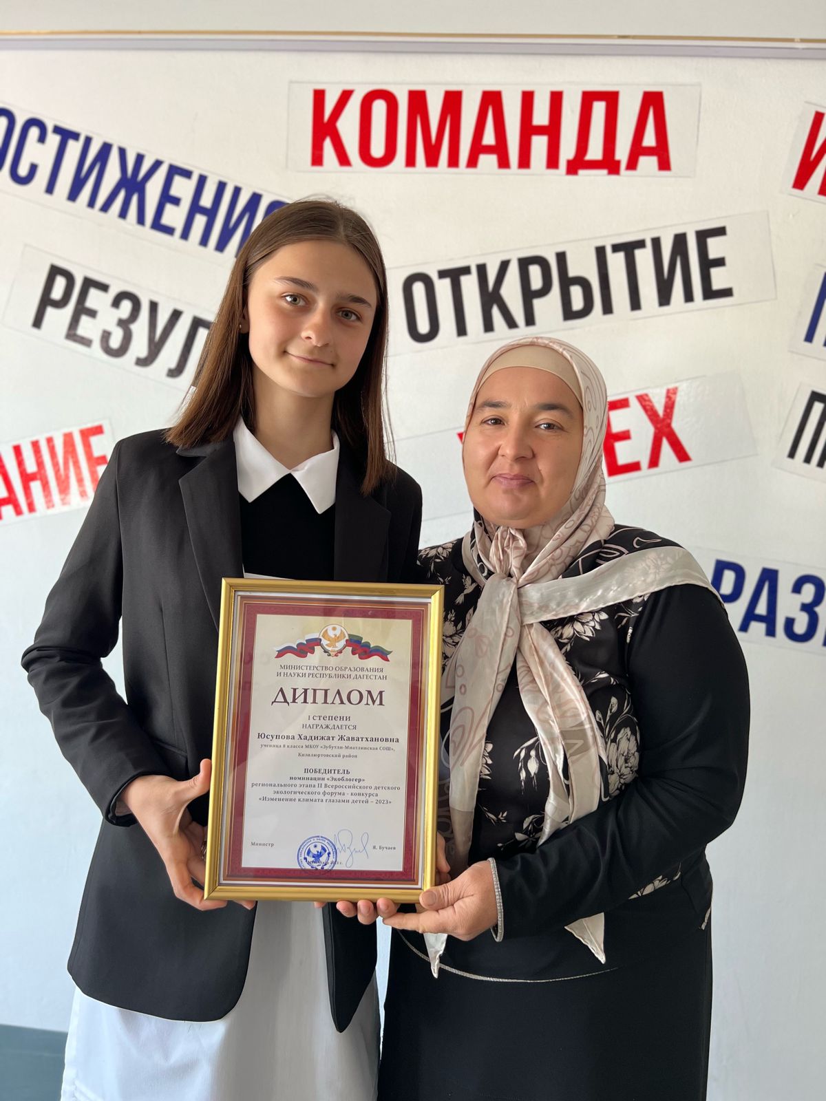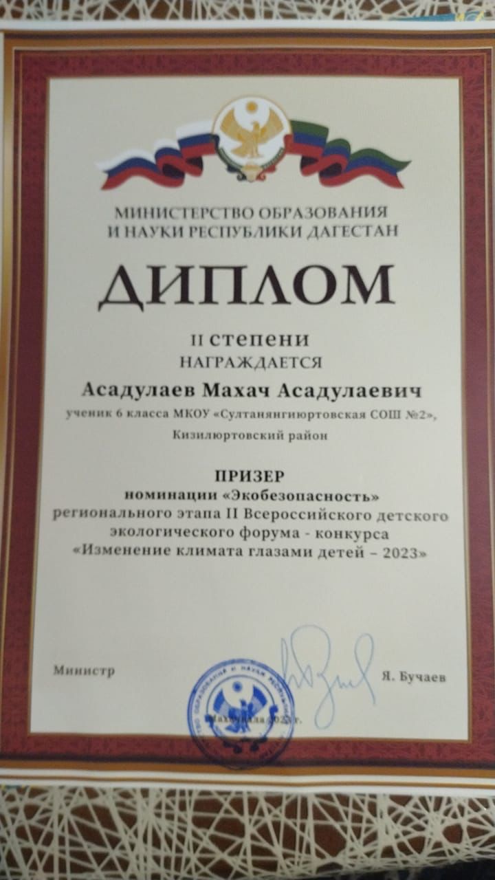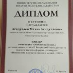 С Кизилюртовского района для награждения были приглашены победители и призеры Регионального этапа экологических конкурсов , обучающиеся МБУ ДО «СЮНиТ» Юсупова Хадижат, победитель Всероссийского детского экологического форума – конкурса «Изменение климата глазами детей», руководитель – педагог дополнительного образования З.А .Садикова, Махач Асадулаев, призер Всероссийского детского экологического форума – конкурса «Изменение климата глазами детей», руководитель – Д. Б. Харчиева, Суайбат Нургишиева , призер Всероссийского молодежного водного конкурса , руководитель-педагог дополнительного образования А. С. Улуева.