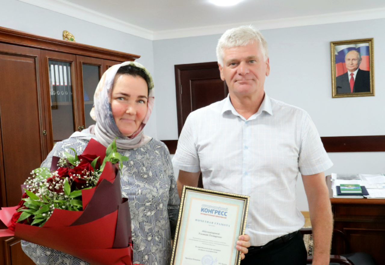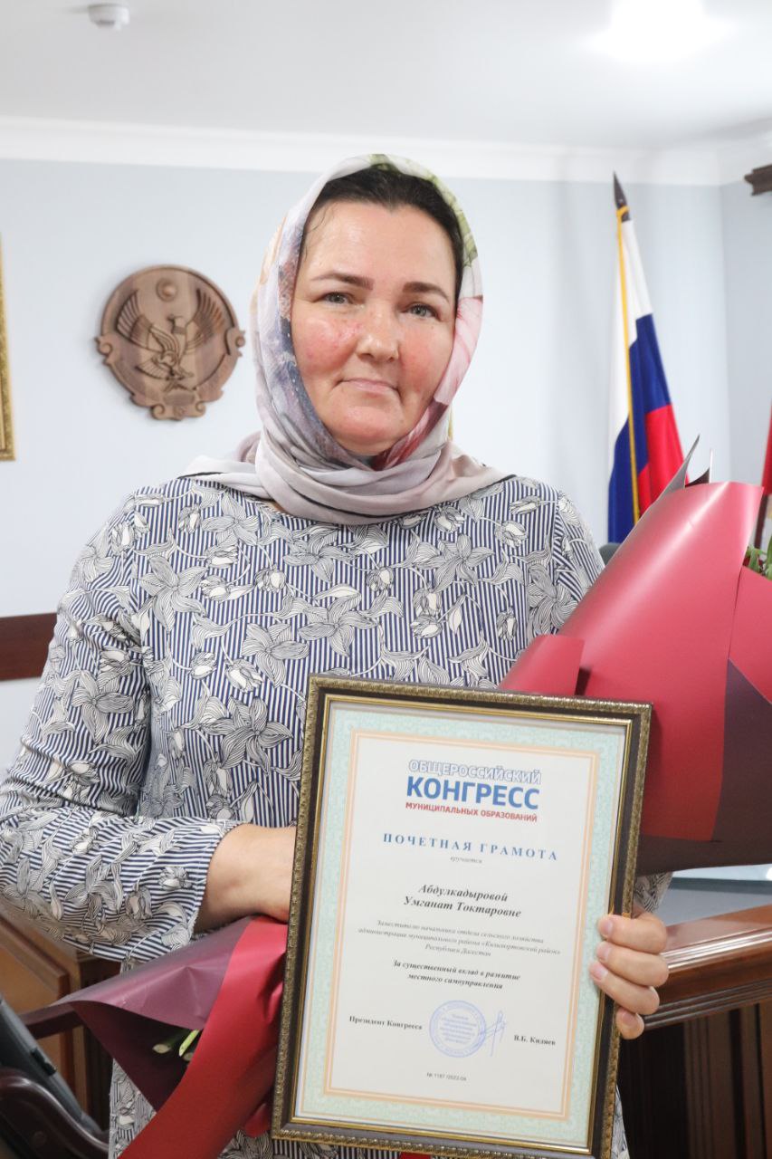 3 августа в своем кабинете глава Кизилюртовского района Рустам Татарханов наградил Почетной грамотой Общероссийского конгресса муниципальных образований «За существенный вклад в развитие местного самоуправления» заместителя начальника отдела сельского хозяйства администрации муниципального района «Кизилюртовский район» Умганат Абдулкадырову.