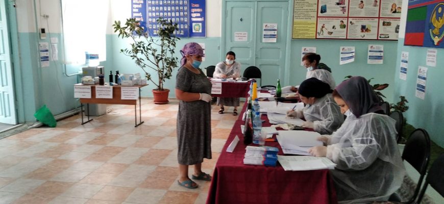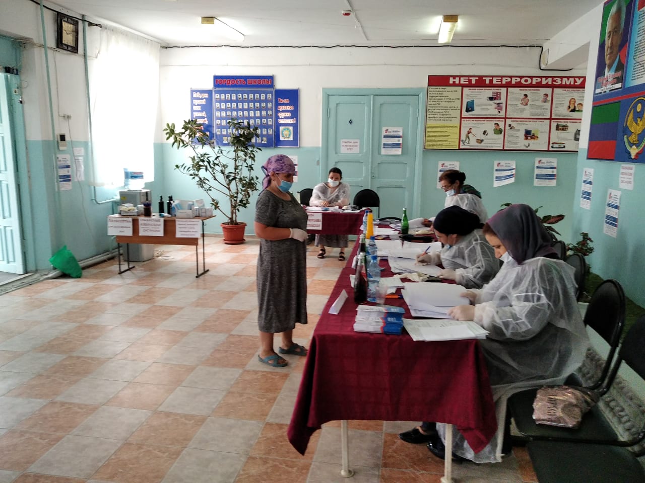 Голосование на участках Кизилюртовского района проходит с соблюдением всех мер санитарной безопасности: организовано измерение температуры, гражданам на входе выдаются средства индивидуальной защиты, все поверхности регулярно обрабатываются дезинфицирующим средством, между людьми соблюдается социальная дистанция.