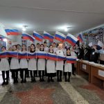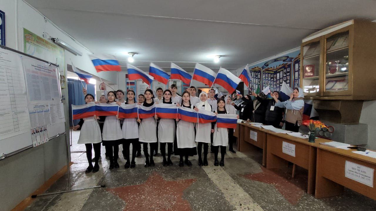 Сегодня, 15 марта, в Нечаевской СОШ №2, где расположен избирательный участок 0703, десятки детей выстроились в ряды и подняли флаги Российской Федерации и Дагестана — как символ крепкой дружбы и единства всех людей в России. Школьники исполнили песню «Россия — это мы» под наставничеством советника- директора по воспитанию, классного руководителя Ирайганат Омаровой.