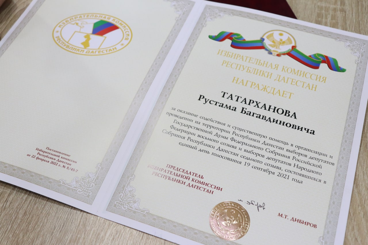 Председатель ТИК первым делом поблагодарил главу Кизилюртовского района Рустама Татарханова за успешную и плодотворную работу и вручил ему от имени Избирательной Комиссии РД Почетную грамоту за ответственное и грамотное исполнение поставленных задач и обязанностей.