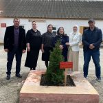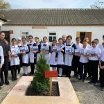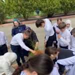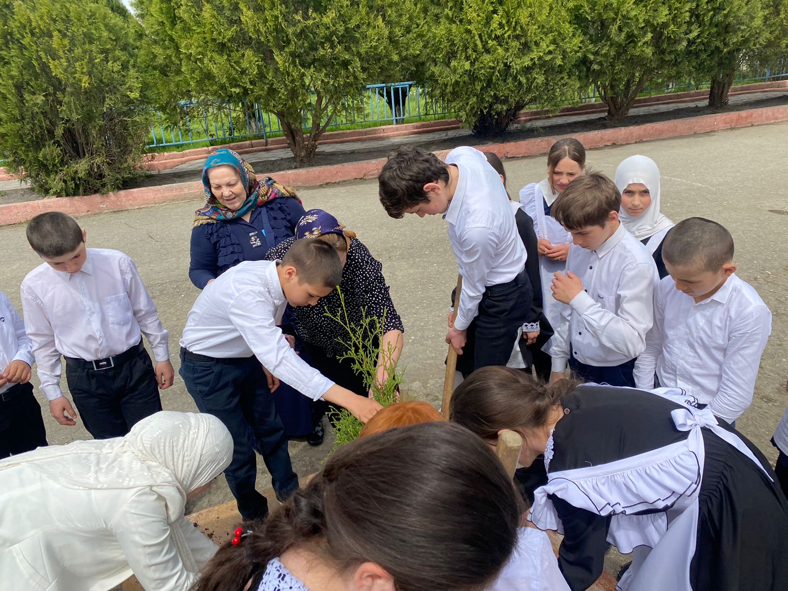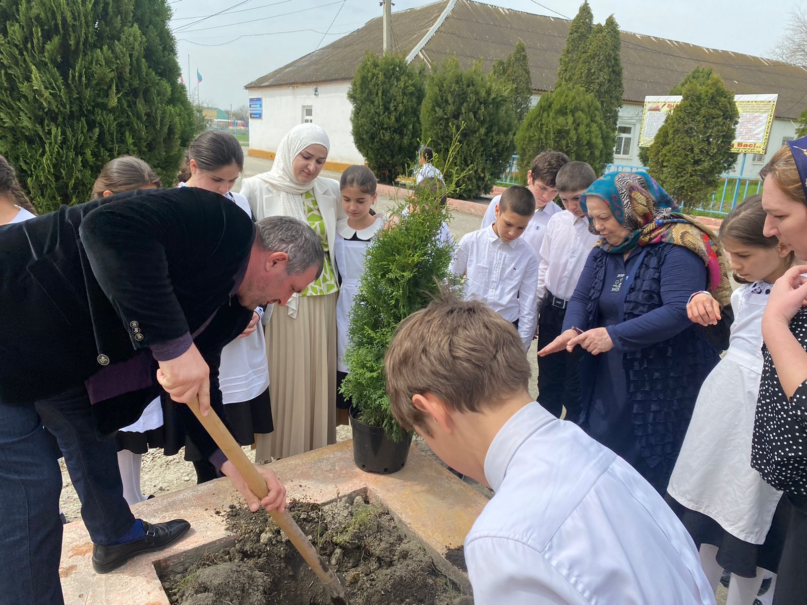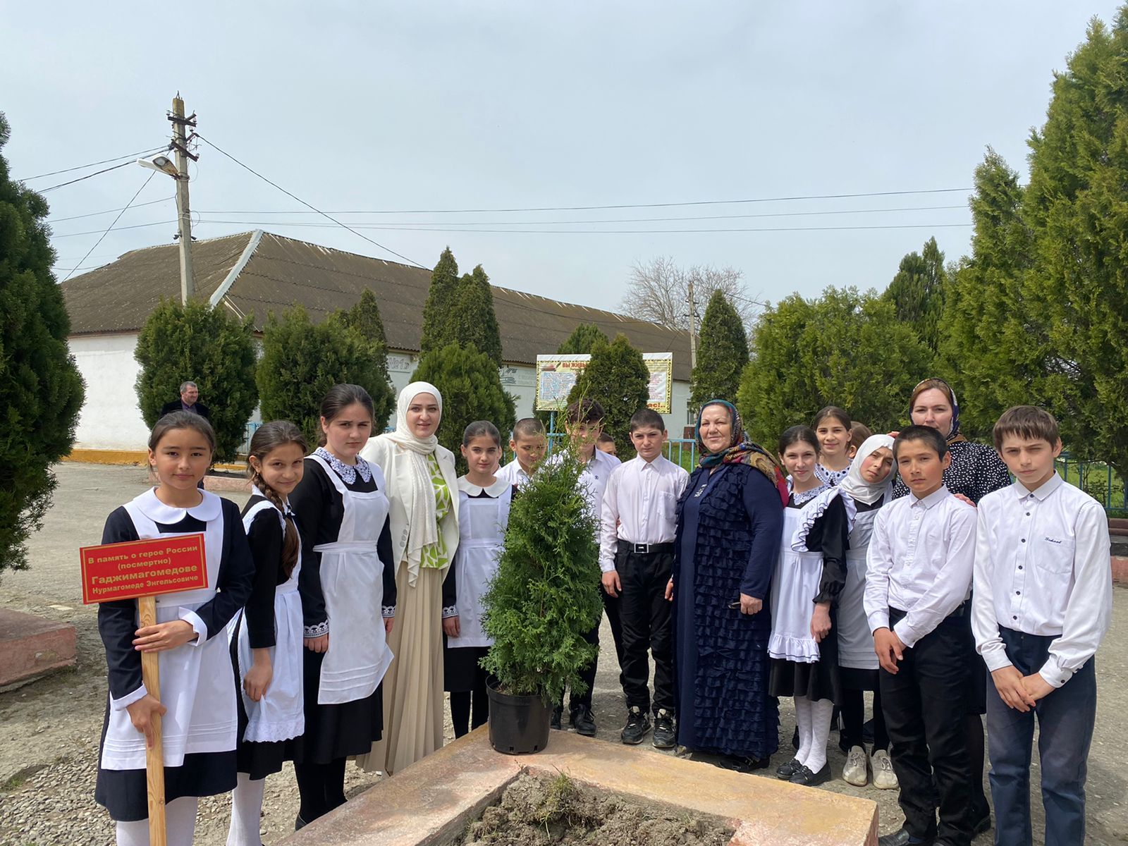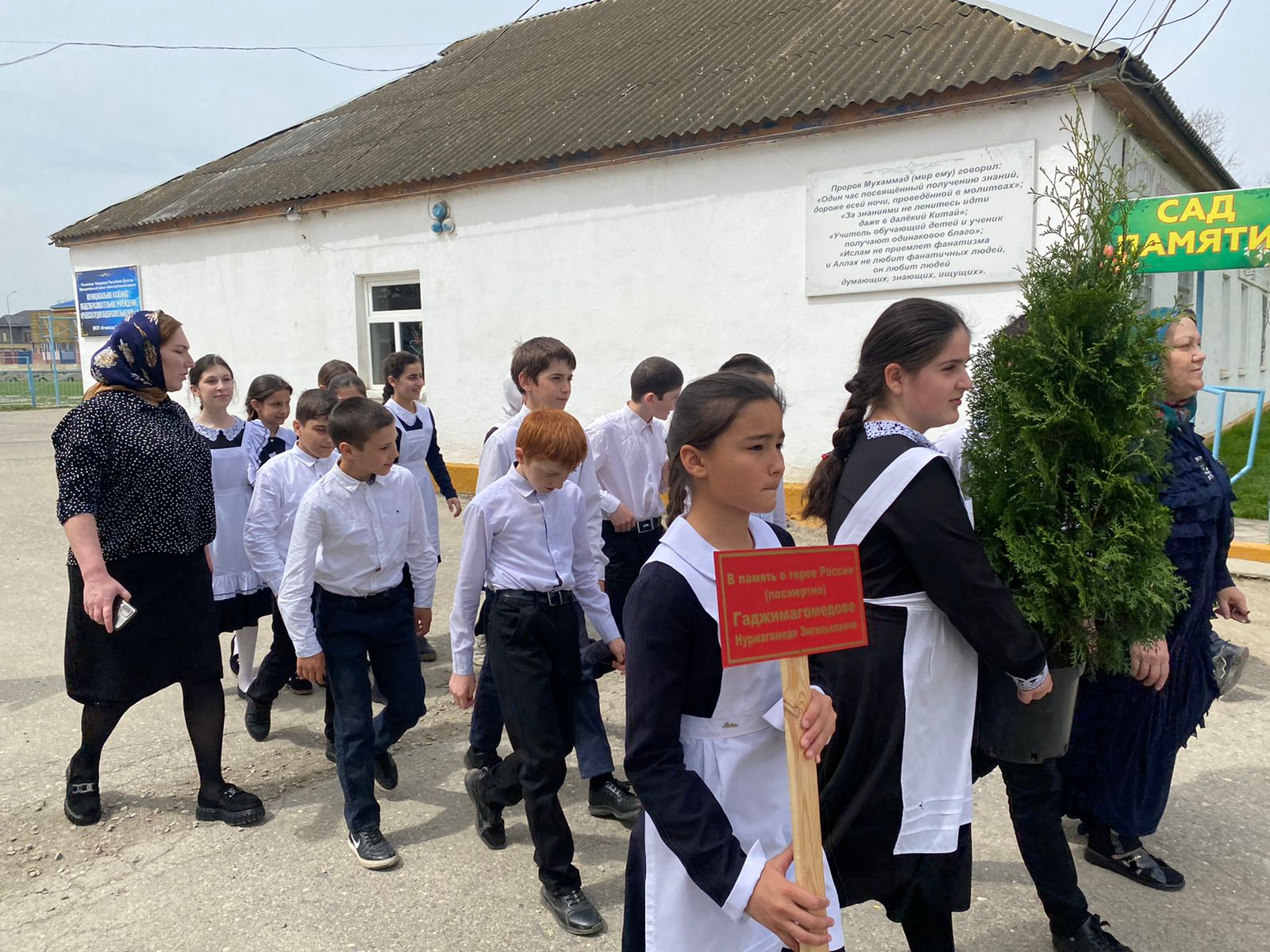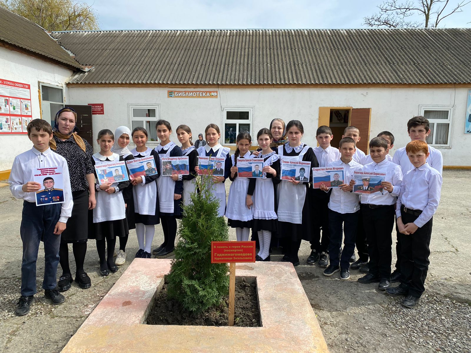 Во дворе школы ученики 6 «а» класса вместе со своей классной руководительницей Саидой Магомедовной Магомедовой посадили дерево с табличкой:»В память о Герое России Нурмагомеде Гаджимагомедове».