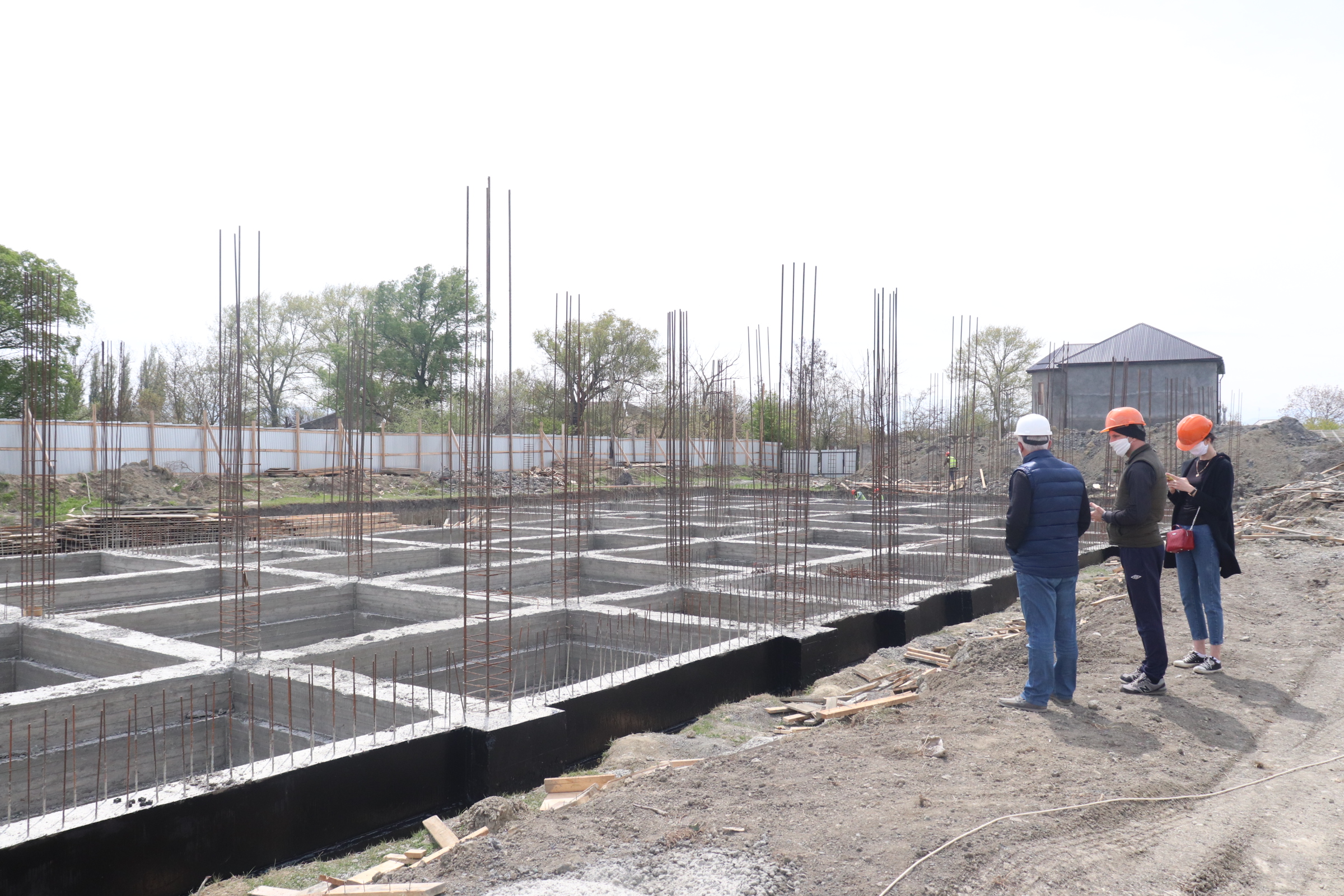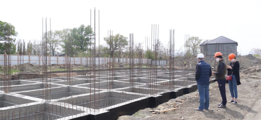 Сегодня, 25 апреля, строители приступили к заливке фундамента опорной стены двухэтажного здания с цоколем, на что потребуется около 760 кубометров бетона. Монтаж фундаментных балок завершен.