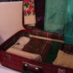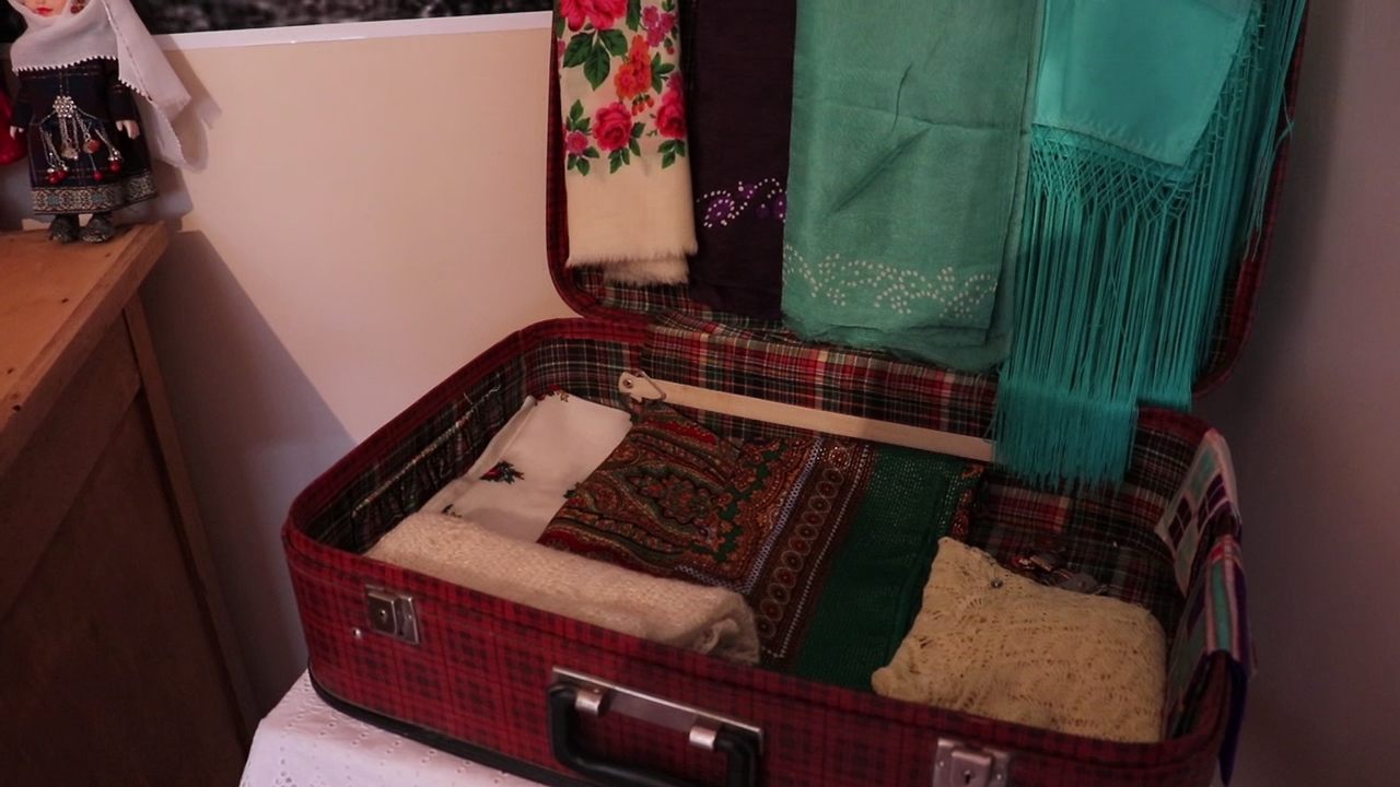 Уголок невесты. Тут и белые туфли, и чемодан, набитый приданным – платки и ткани. Рядом сундуки и кинжал, джурабы.