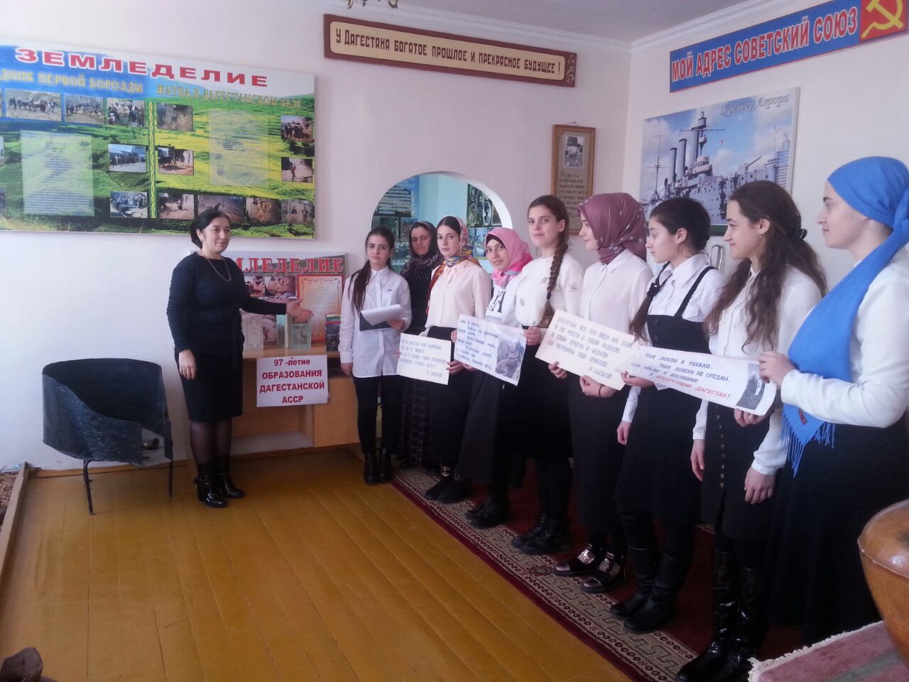 Дети работали на классных часах по карте и атласам. Был оформлен стенд «Односельчане в годы войны», посвященный этой дате. В библиотеке была оформлена книжная выставка «История Дагестана.