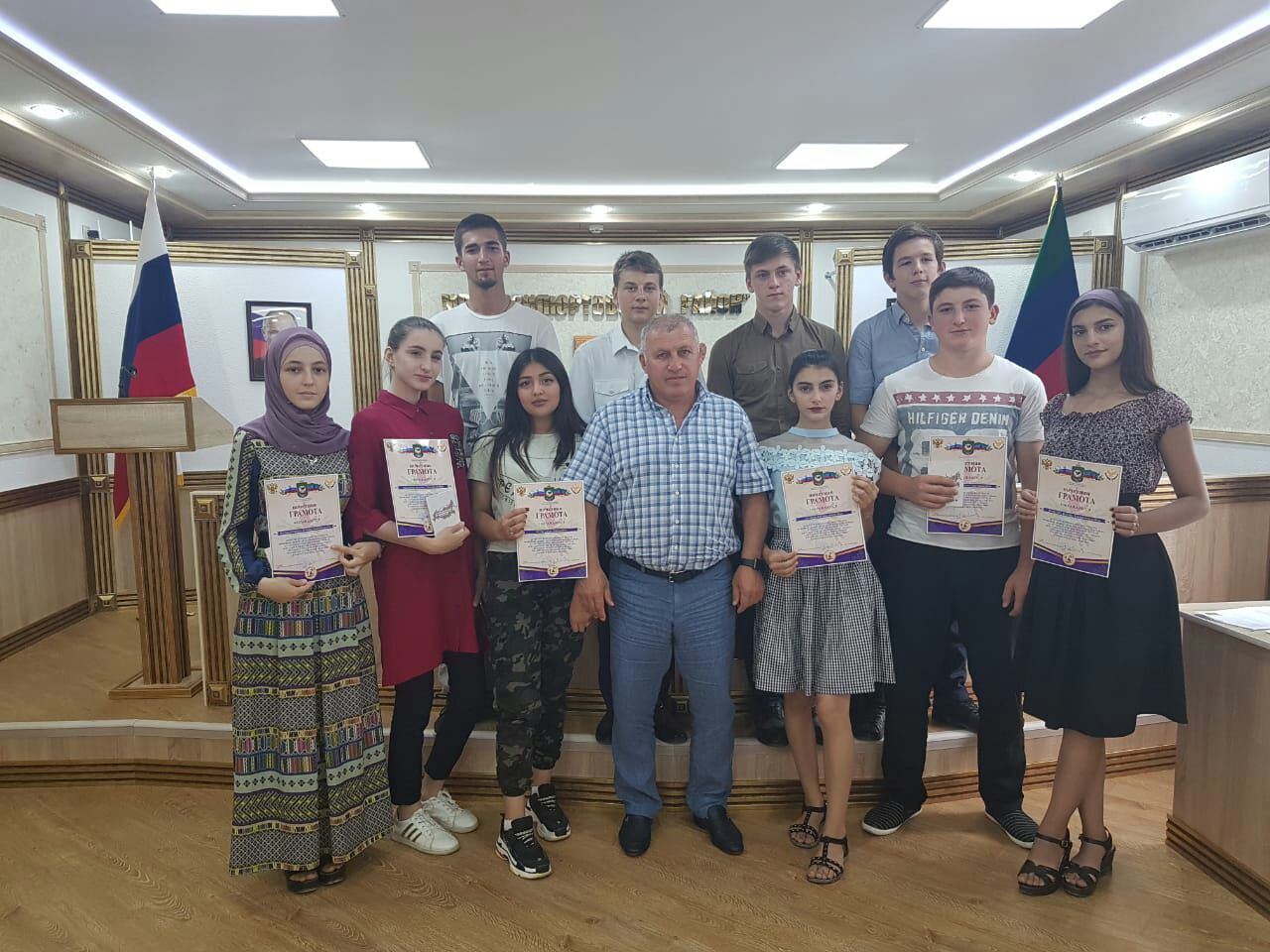 Завершилась торжественная часть совместной фотографией с главой района Магомедом Шабановым. Руководитель района поблагодарил волонтеров за активную жизненную позицию и пожелал им успехов в дальнейшей работе.
