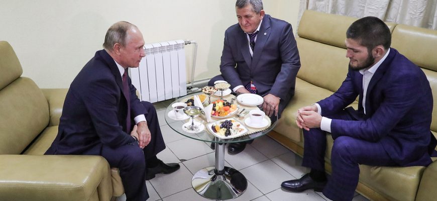 Владимир Путин встретился с российским борцом, чемпионом UFC в легком весе Хабибом Нурмагомедовым. Глава государства поздравил борца с победой в соревнованиях. На встрече присутствовал отец спортсмена.